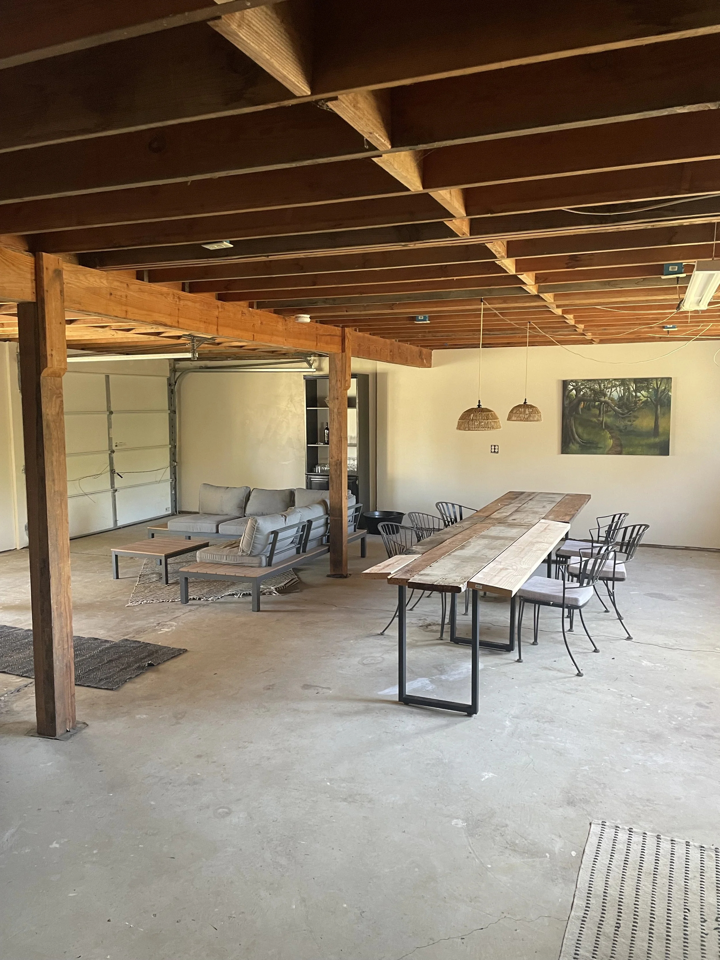 This two story rustic, industrial barn is perfect for dinner parties or special events. The living quarters are upstairs with private seating. The one bathroom is downstairs. 20 people max capacity for dining.